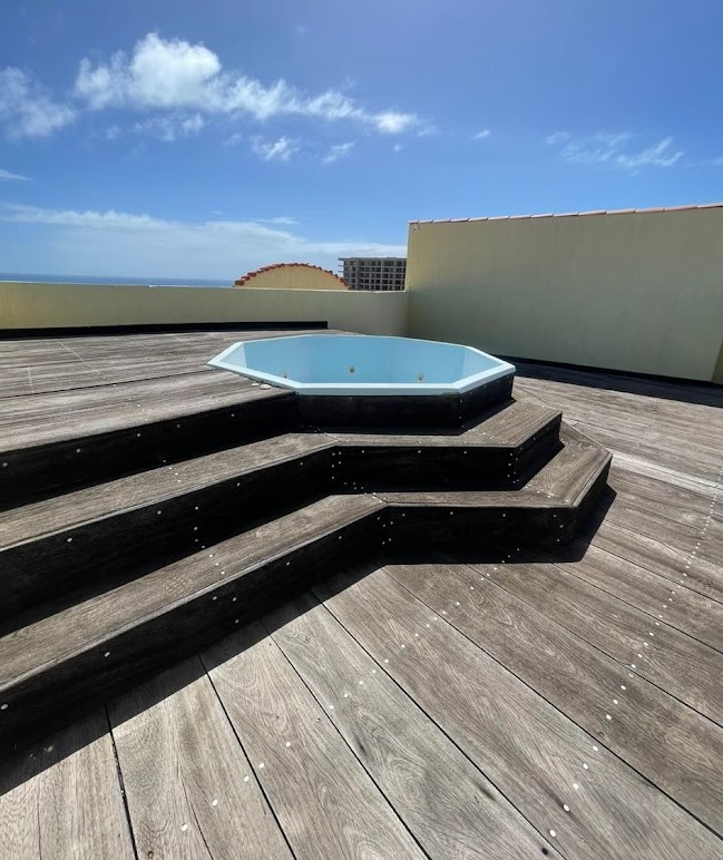 Deck en madera tropical con jacuzzi, donde podrás relajarte con vistas al atardecer.